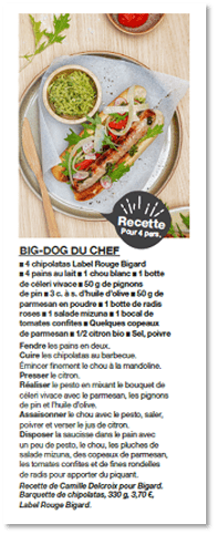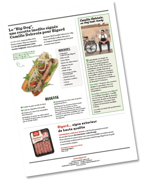 Wellcom s’est associé avec Camille Delcroix, le jeune Chef rock’n roll gagnant « Top Chef » 2018 pour inventer la recette inédite du « Big-Dog » Bigard. Avec une pincée de tradition bouchère, saupoudrée de Label Rouge et de gastronomie à la française, le résultat est délicieux.