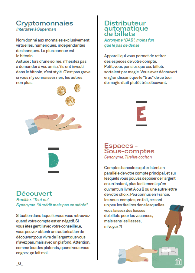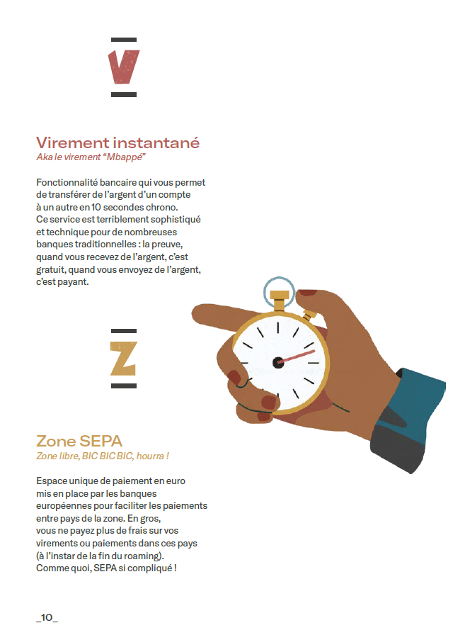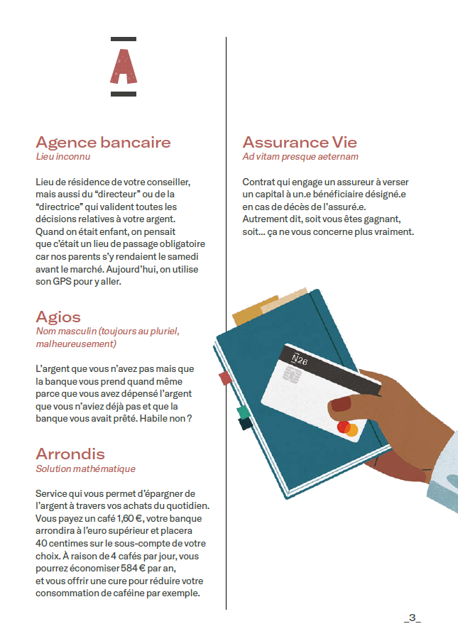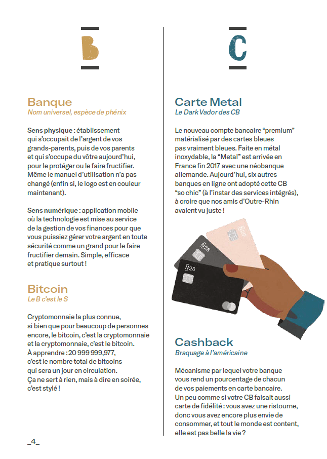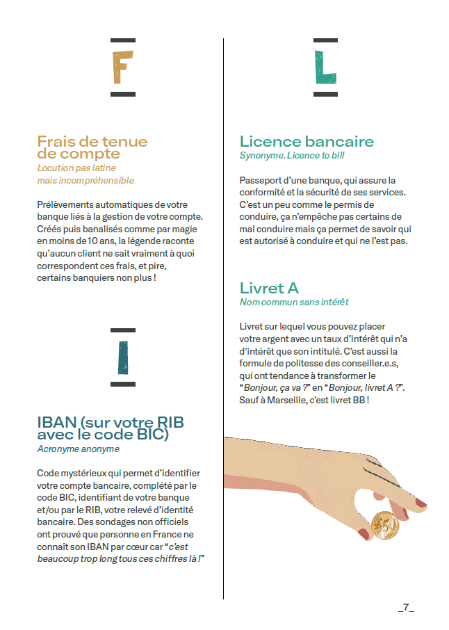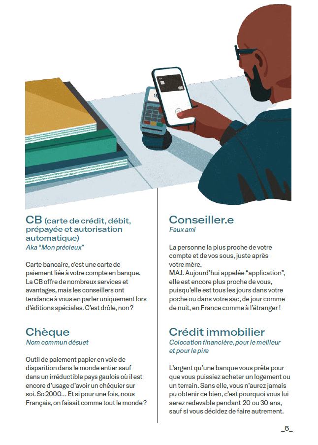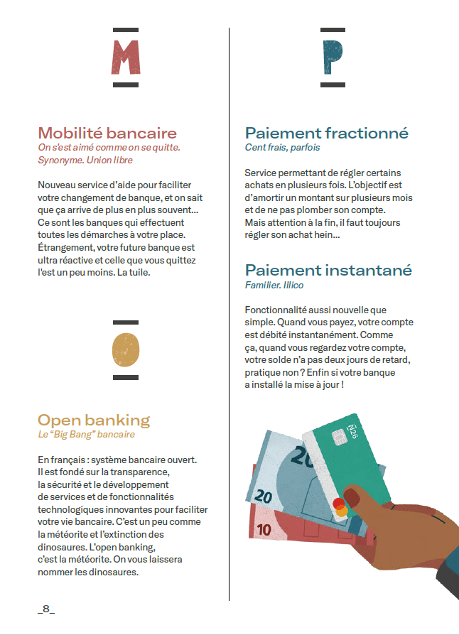 Partant de la défiance déclarée des Français à l’égard de leur banque et notamment de la complexité de leur langage, nous avons développé “Parlez-vous banquier” : un dictionnaire avec 30 définitions qui soulignent avec humour l’opacité des argumentaires des banques traditionnelles.