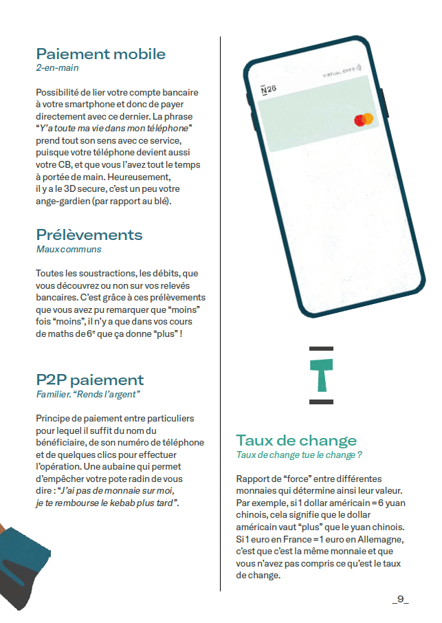 Nous avons choisi 30 termes bancaires courants (Agios, Bitcoin, Cashback…) et avons écrit une définition telle qu’elle est utilisée par les banques traditionnelles, puis nous l’avons “traduite” dans un langage facilement compréhensible du grand public (Agios : nom masculin, toujours au pluriel, malheureusement…).
