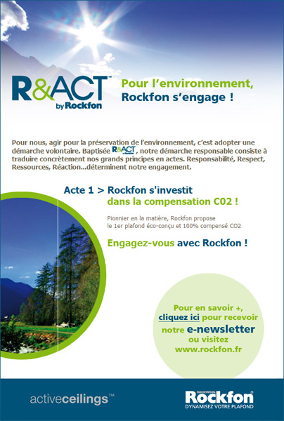 Comment incarner la démarche Développement durable du leader mondial du marché des plafonds acoustiques en laine de roche ? C’est le défi relevé par Wellcom avec la création du programme « R&Act » de Rockfon, déclinant l’engagement du fabricant à travers ses principes de responsabilité, respect, ressources et réactivité qui sont les siens.