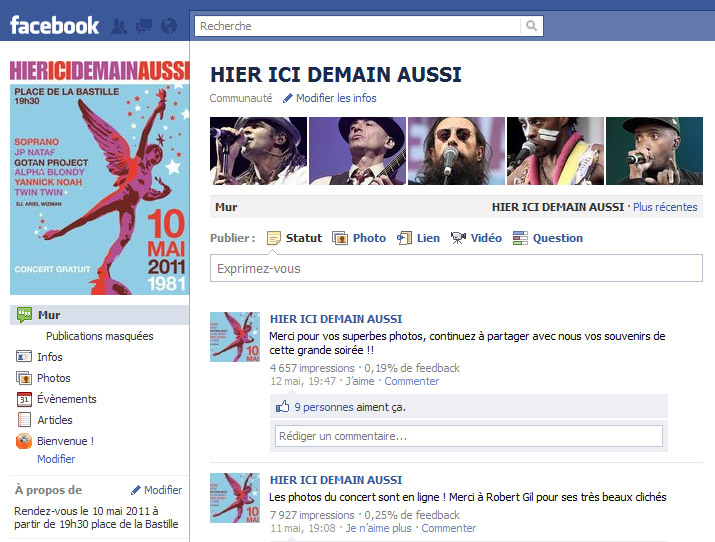 Sollicitée par le 3ème Pôle (agence de communication évènementielle) pour la médiatisation d’un grand concert organisé le 10 mai 2011 place de la Bastille, Wellcom a conçu un dispositif de communication visant à promouvoir cet évènement : un concept visuel décliné sur différents supports, des éléments de langage pour les prises de paroles médias et l’animation d’une page Facebook. Un dispositif complet qui aura généré une large visibilité off et online. Au final, près de 70 000 personnes se sont déplacés place de la Bastille pour un concert évènement mémorable !