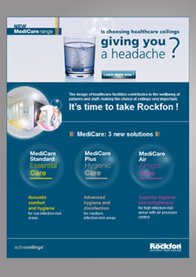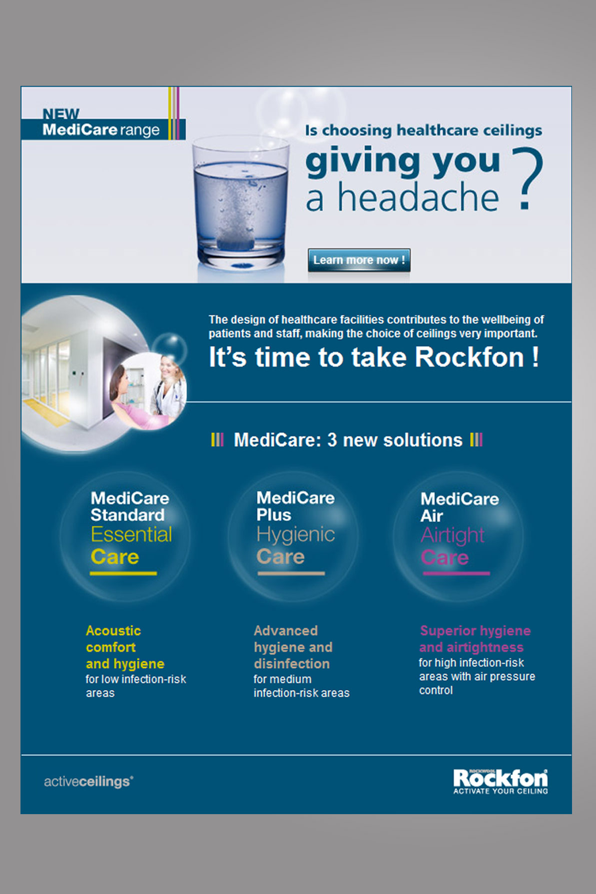 Sur la base d’un concept décalé Choisir un plafond pour un Etablissement de santé est-il un casse-tête ? / Is choosing healthcare ceilings giving you a headache ? et d’un visuel accrocheur, le dispositif mis en place s’est appuyé sur un programme de marketing direct complet (mailing et emailing) et d’un soutien sur le web avec la création d’un hub dédié : http://www.rockfon.fr/hub/medicare