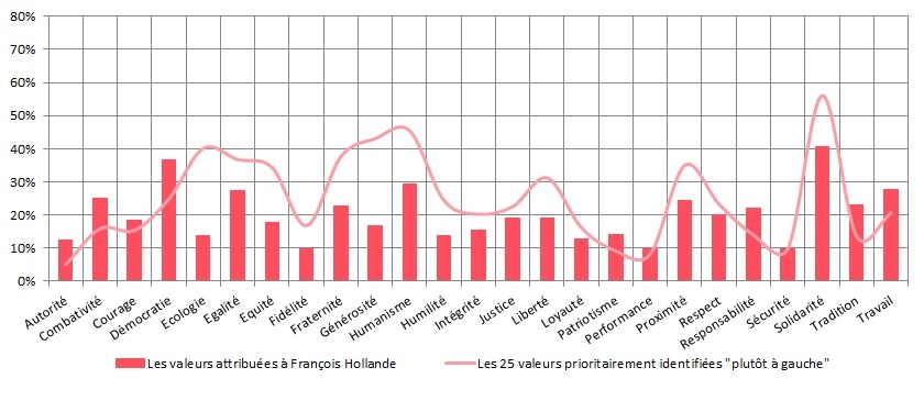 Les valeurs attribuées à François Hollande et celles identifiées plutôt à gauche :