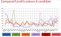 François Hollande compte également parmi les candidats dont le niveau des valeurs les plus visibles reste faible. Sa seule valeur atteignant plus de 40%