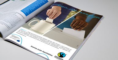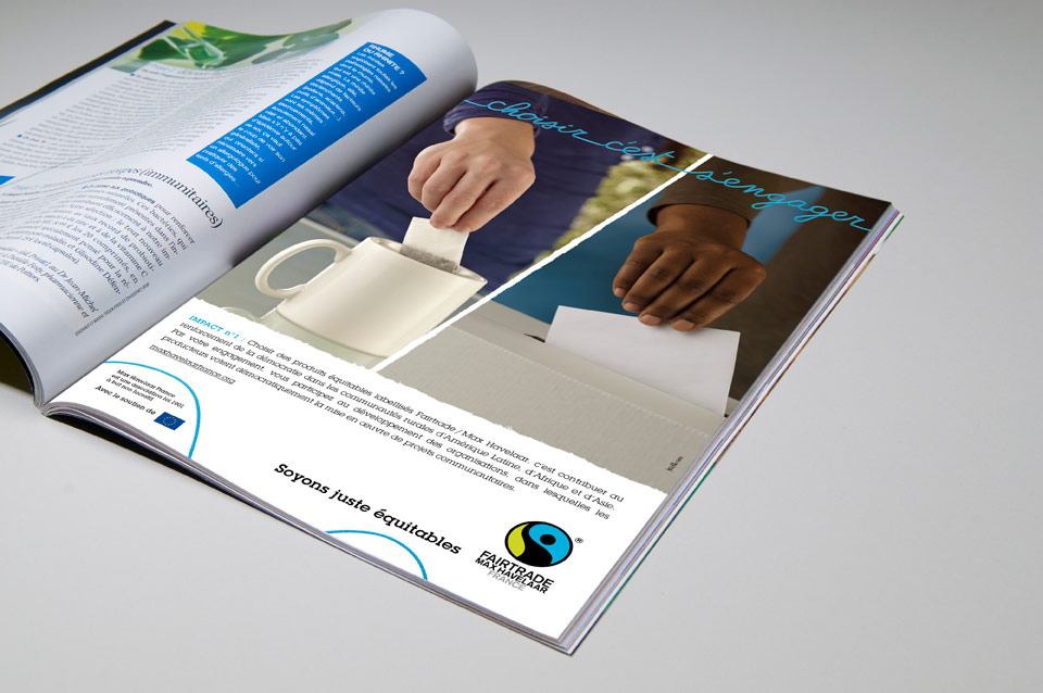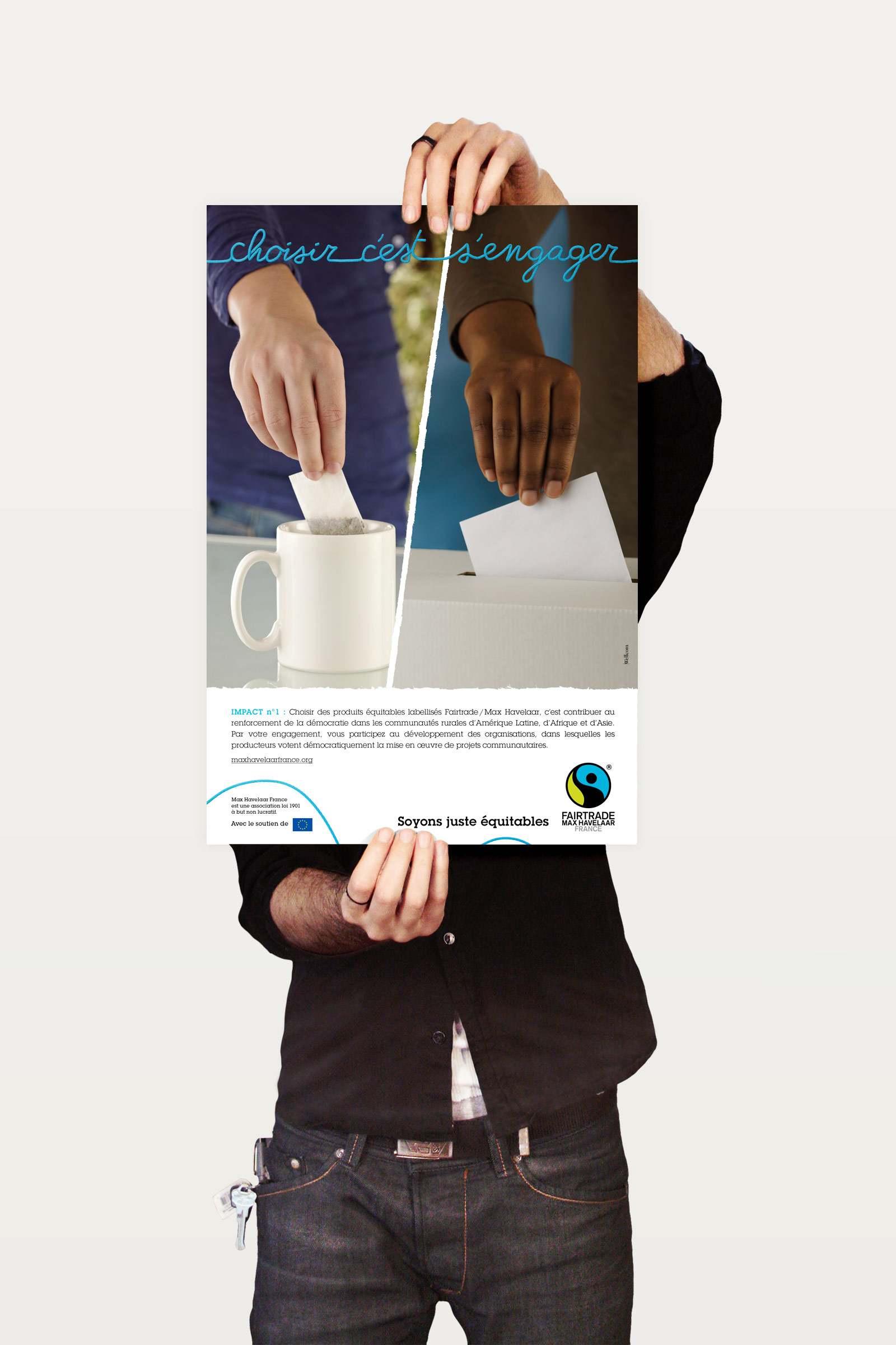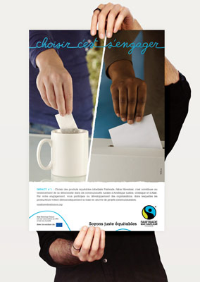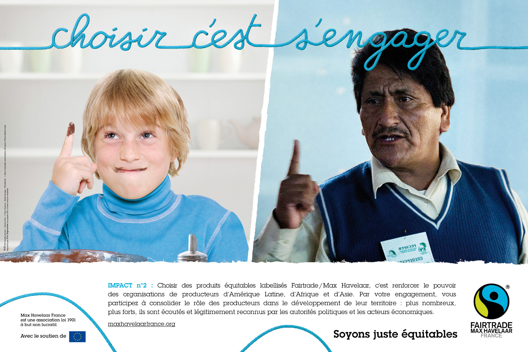 Au-delà de ce positionnement, un concept fort : « Choisir c’est s’engager », représenté sous forme de fil bleu, symbole du lien de solidarité qui unit le Nord et le Sud, évoquant de manière très visuelle l’impact – social, politique, économique, environnemental …- d’une consommation équitable dans les communautés rurales du Sud.