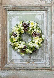 La couronne de porte de Noël, pour un accueil naturellement sophistiqué : en plus de ses traditionnels centres de table, le spécialiste de la rose propose pour les fêtes un choix exquis de couronnes de porte revisitées.