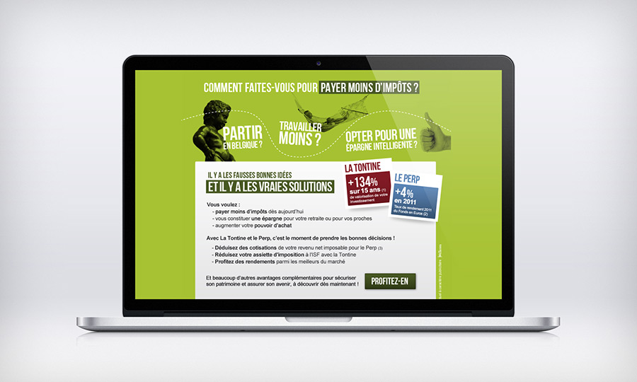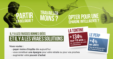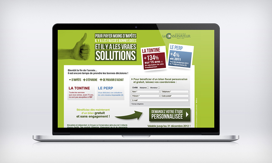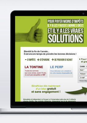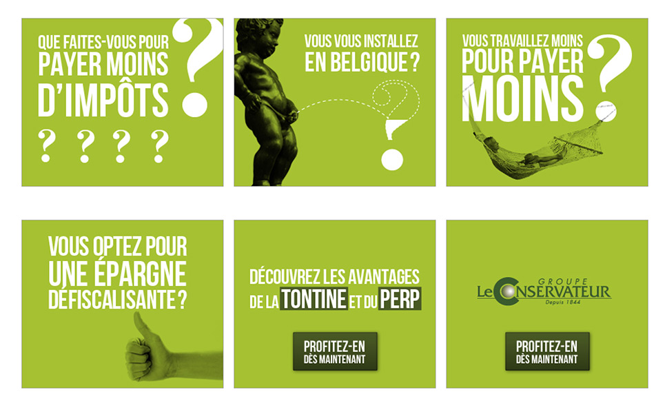 Le concept ? Interpeler les investisseurs potentiels en leur présentant l’éventail des possibilités de défiscalisation : exil fiscal, réduction du temps de travail, ou la solution astucieuse : un produit financier Le Conservateur.