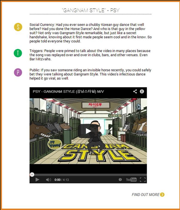 Dans son livre Berger distille quelques conseils pour « devenir viral ». Des conseils basés sur des expériences ou des recherches qu’il a eu l’occasion de mener. Ainsi, premier enseignement, pour qu’un message soit davantage diffuser, Berger déclare qu’il faut lier son produit à des situations familières et fréquentes. Pour illustrer son arguement, Berger prend un contre-exemple. La campagne développée par Geico, il y a quelques années, qui mettait en scène un homme préhistorique. « Nous ne voyons pas beaucoup d’hommes des cavernes dans nos vies quotidiennes. La publicité ne va probablement pas venir à l’esprit, ce faisant la marque ne deviendra pas instinctivement un sujet de discussion ou une occasion de changement de comportement. »