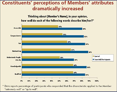 La méthode utilisée a consisté en l’organisation à la fois de petites réunions sur Internet entre un membre du congrès et quelques citoyens de la circonscription, et des réunions publiques avec une audience plus large. Chaque citoyen était libre, soit de participer aux discussions en ligne, soit de participer à des réunions publiques classiques. Les discussions en ligne sont appelées « Town Hall Participants » (en bleu sur le diagramme), et celles dont la forme est plus traditionnelle, « Control » (en jaune). Les résultats de cette étude sont particulièrement intéressants.
