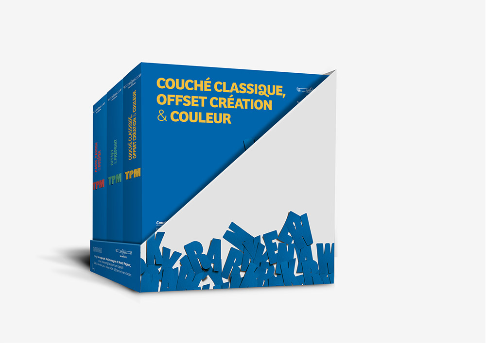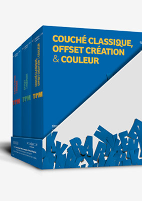 Trois classeurs réunis dans une boîte écrin présentent, sous forme de nuanciers, les papiers des gammes :