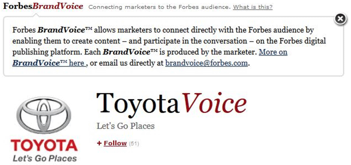 Des titres de presse se sont également laissés séduire notamment comme Forbes qui a créé un espace dédié à ce genre de contenu. Un espace explicitement dénommé « Brand Voice ». Un espace qui compte déjà plusieurs dizaines de marques partenaires.
