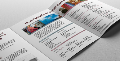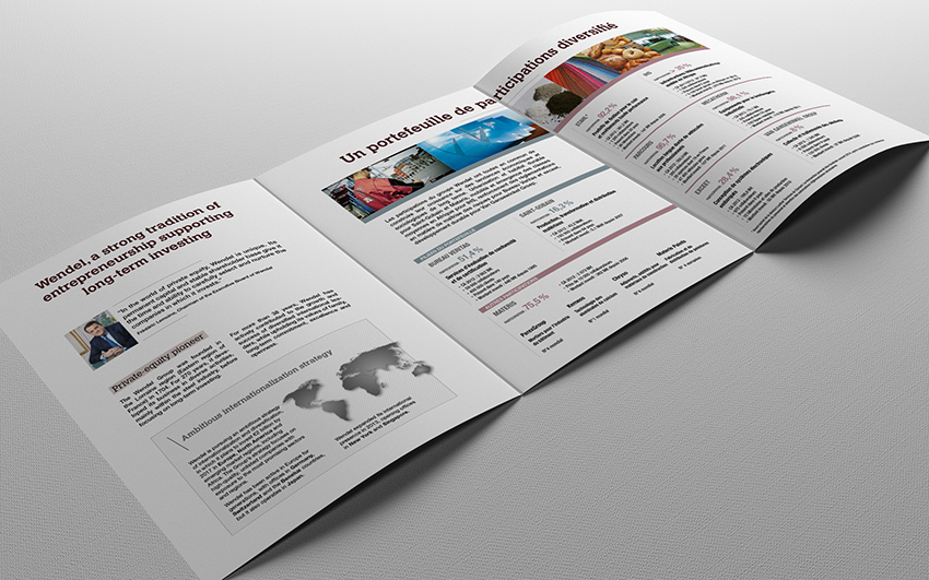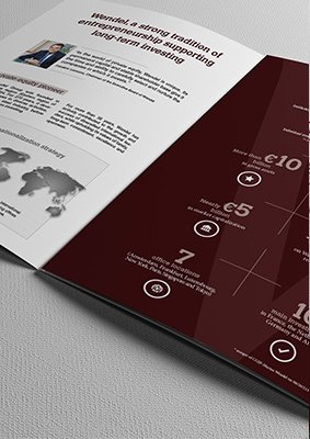 Né en Lorraine en 1704, Wendel est l’une des toutes premières sociétés d’investissement cotées en Europe. Elle investit en France et à l’étranger, dans des sociétés leaders dans leur secteur : Bureau Veritas, Saint-Gobain… dans lesquelles elle joue un rôle actif d’actionnaire industriel. Elle met en oeuvre des stratégies de développement à long terme qui consistent à amplifier la croissance et la rentabilité de sociétés afin d’accroître leurs positions de leader. Wendel a fait confiance à l’agence Wellcom pour la réalisation de sa brochure institutionnelle. Diffusée en France et à l’étranger cette brochure présente le Groupe, son histoire, son portefeuille de participations. L’accent est également mis sur les plus belles réalisations du Groupe. Les contenus sont mis en scène dans un environnement graphique à la fois épuré et coloré, dans le respect des codes graphiques du Groupe.