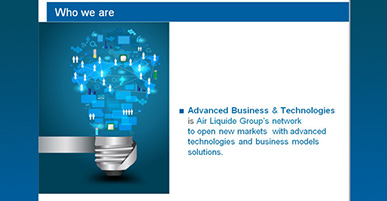 Sa mission ? Ouvrir de nouveaux marchés par une mise sur le marché plus efficace des innovations et technologies développées par le Groupe. Véritablement engagé dans une démarche entrepreneuriale et d’innovation avec un ensemble unique de compétences, Air Liquide aB&T constitue le réseau du Groupe pour l’incubation de nouvelles activités.