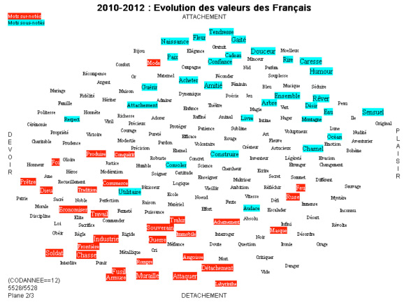 Ces enseignements sont extraits du Baromètre des Valeurs des Français (BVF) de TNS Sofres publié fin septembre, réalisé tous les deux ans depuis 1990 et obtenu à partir de la Sémiométrie, méthode propriétaire de l’institut. Cette dernière consiste en la notation, sur une échelle de -3 à +3, par un large panel de plus 5 500 Français, d’une série de 210 mots, considérés comme sémantiquement stables. Après analyse, ces mots sont placés au sein d’un mapping composé de deux axes en fonction de leur progression ou de leur régression. En ordonnée, les mots sont organisés selon qu’ils connotent l’attachement ou le détachement et en abscisse, les mots dénotant le devoir ou le plaisir. Sur cette cartographie apparaît alors un profil psychologique des Français qui structure leur imaginaire et leurs opinions en fonction des valeurs auxquelles ils accordent de l’importance.