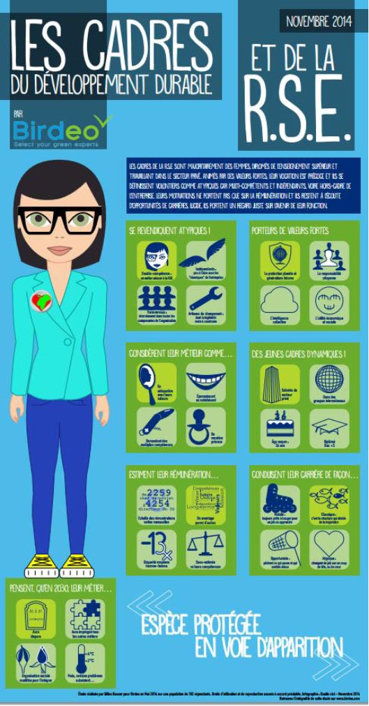 C’est le sociologue Gilles Hauser qui à travers l’analyse des parcours, motivations, missions, compétences et perspectives, identifie de nombreux traits communs : haut niveau d’éducation, pluridisciplinarité, multi expériences… mais aussi valeurs communes ! « L’enseignement majeur de cette étude est que ces profils sont souvent dotés d’une double, voire d’une triple compétence. Formés en RSE et/ou Développement Durable, ils disposent également d’un savoir-faire métier : ils sont ainsi un atout essentiel pour l’entreprise. L’avenir laisse en outre entrevoir une professionnalisation de ces métiers du Développement Durable, qui se structurent par secteurs bien définis. J’aime également noter les fortes valeurs qui caractérisent ces cadres, sans pour autant tomber dans le militantisme une fois dans l’entreprise », explique Caroline Renoux, fondatrice de Birdeo.