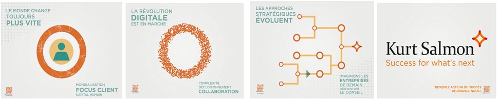 Pour soutenir ce nouveau message, Kurt Salmon se dote d’une nouvelle base line : « Success for what’s Next » et s’offre une campagne (dans le métro, stations Pont de Neuilly, La Défense-Grande Arche, Etoile, Auber et Opéra et dans la presse sur lesEchos.fr, supplychainmagazine.fr, optionfinance.fr, l’Agefi, consulting-guide.fr).