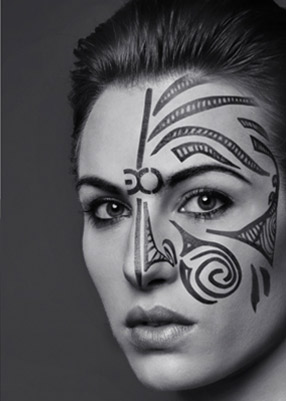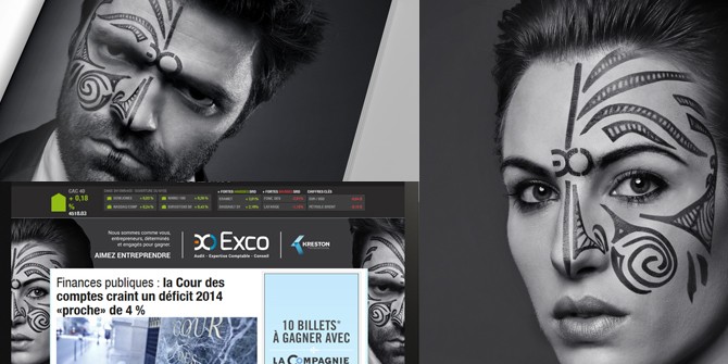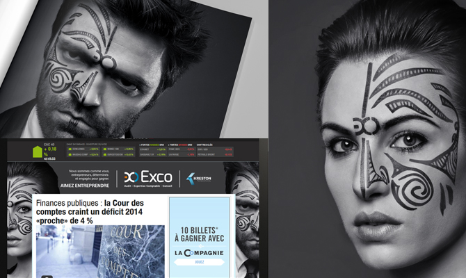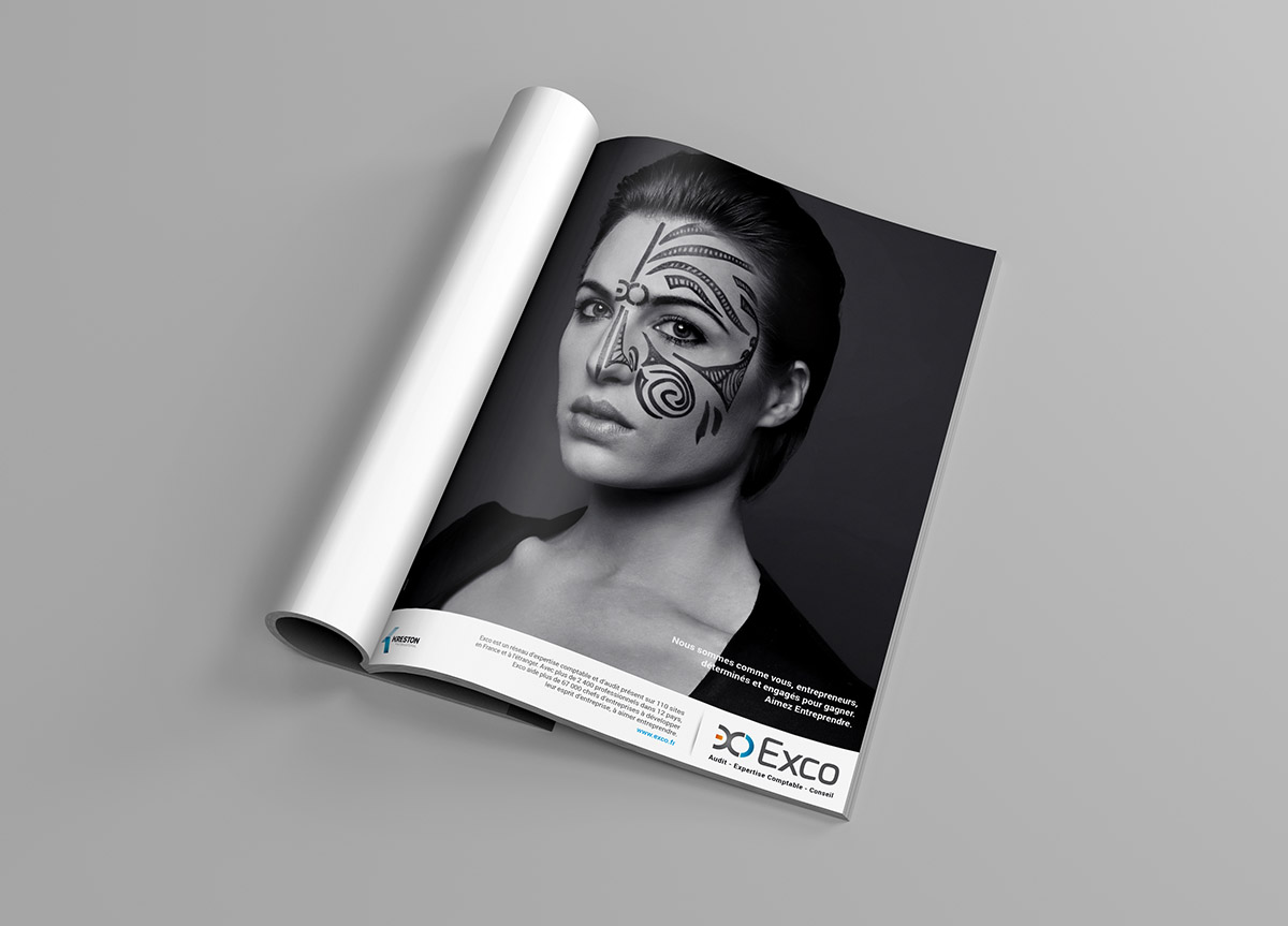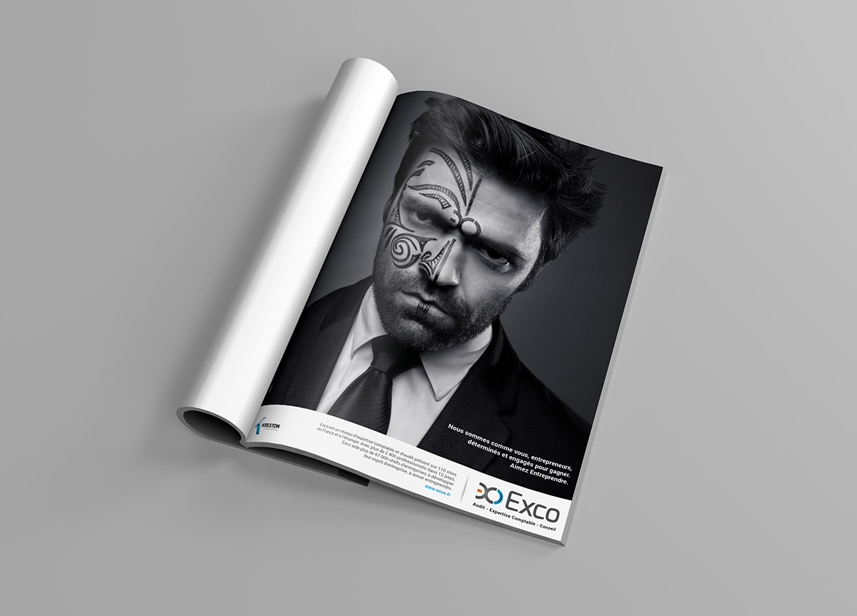 Un visuel fort, un homme et une femme aux visages tatoués dans le respect de l’art maori, illustre l’instinct d’entrepreneur qui anime les dirigeants : ce que les autres ne voient pas, les équipes d’Exco le remarquent instantanément, leur combativité étant inscrite sur leur visage.