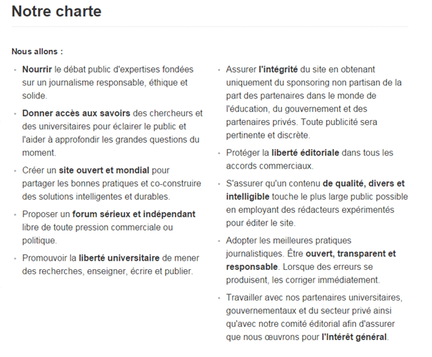 L’indépendance apparait également comme un véritable leitmotiv de ce medium. « Nous avons établi de nouveaux protocoles et de nouvelles règles afin d’aider à rebâtir la confiance envers le journalisme de qualité. Tous nos auteurs et nos journalistes ont signé notre Charte éditoriale. Et tous nos contributeurs doivent respecter Les Règles de notre Communauté. Nos auteurs n’écrivent que sur les sujets de leur champ d’expertise, précisé dans le cadre de leur article. Les sources de financement de nos auteurs doivent être rendues publiques, pour éviter les conflits d’intérêts. Si ces règles ne sont pas respectées, les auteurs pourront être interdits de publication sur le site. »