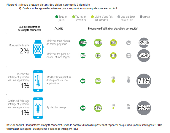 L’usage du smartphone est tellement central que ce dernier freine l’adoption d’autres objets connectés. Et quand ces derniers sont adoptés, ils ne sont pas nécessairement utilisés régulièrement. Seules 1 % des personnes interrogées possèdent un thermostat intelligent. Elles sont 71 % à ne jamais l’utiliser. Les heureux propriétaires de montre intelligente sont cependant 18 % à l’utiliser tous les jours pour « maitriser son niveau de forme physique ». Le smartphone reste un véritable coach sportif pour 16 % des mobinautes.