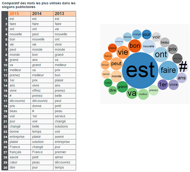 Pour continuer dans la nouveauté, l’observatoire recense le top 3 des « mots de la publicité qui ont le plus progressé par rapport à l’année précédente ». Le millésime de 2015 est composé de « climat », « taux » et « 2015 ».