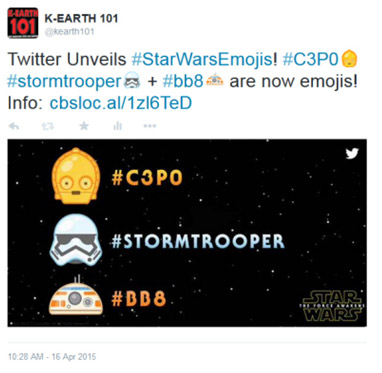 Sur Twitter, plusieurs hashtags liés à l’univers de Star Wars ont fait apparaître plusieurs émoticônes affichant les personnages cultes du film. On parle évidemment ici d’un phénomène planétaire et ce dispositif reste exceptionnel mais il montre le poids que peut représenter un film sur les réseaux sociaux.