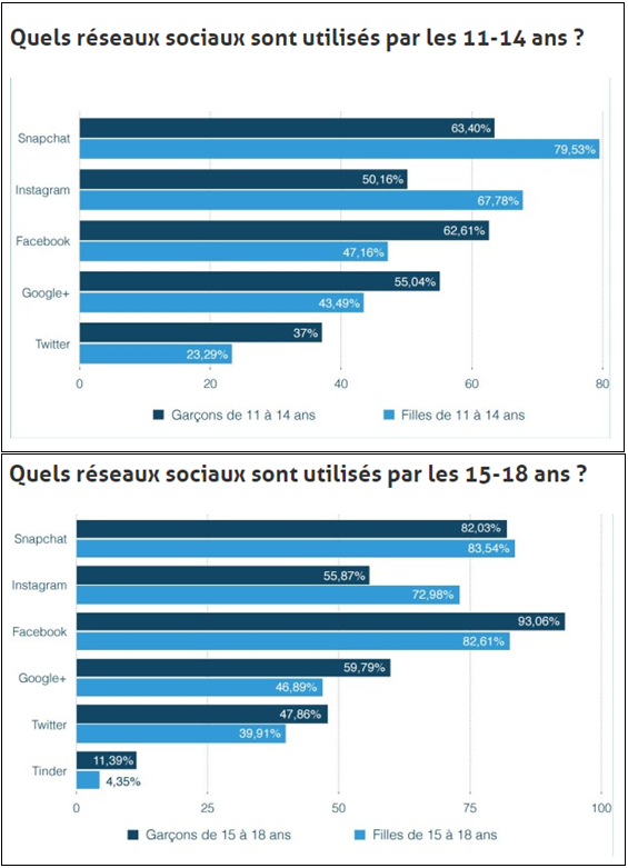 On apprend qu’ils ont un usage quotidien d’Internet, se connectant pour une large majorité plus de 10 fois par jour. Avec des sessions qui sont très longues – plus de 2 heures dans la journée pour 57 % des sondés. Si le réseau social préféré évolue en fonction du sexe et de l’âge, ils sont plus de 7 adolescents sur 10 à être membres d’au moins un réseau social. Les réseaux préférés des 11-14 ans sont Snapchat et Instagram. Facebook reste celui des 15-18 ans. Le réseau préféré des filles est Snapchat, pour lequel près de 8 filles sur dix possèdent un compte contre 63, 4 % chez les garçons.