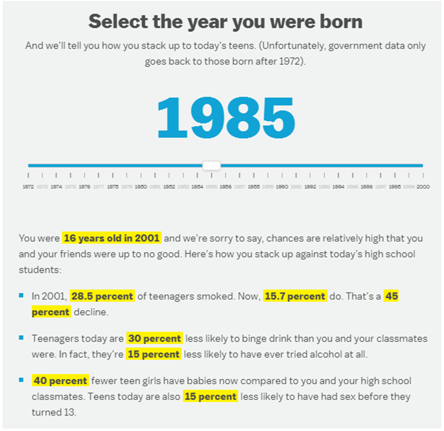 C’est cette maturité qui est intéressante et qui est l’objet de l’article. Au-delà d’adopter un comportement digital sagace, la génération Z semble être raisonnable dans tous les pans de leur vie. Une étude menée chaque année par le gouvernement américain tend à prouver cette réalité. Depuis 1991, le gouvernement publie Youth Risk Behavior Surveillance System, un panorama des comportements à risque des ados. Grâce à une appli développée par VOX, il est donc possible de constater le sérieux de cette génération. En fonction de l’année de naissance, il faut être né après 1972 pour pouvoir comparer. Le site met en relation les statistiques de l’époque et celle de la génération Z. Voilà ce que cela donne pour quelqu’un né en 1985 :