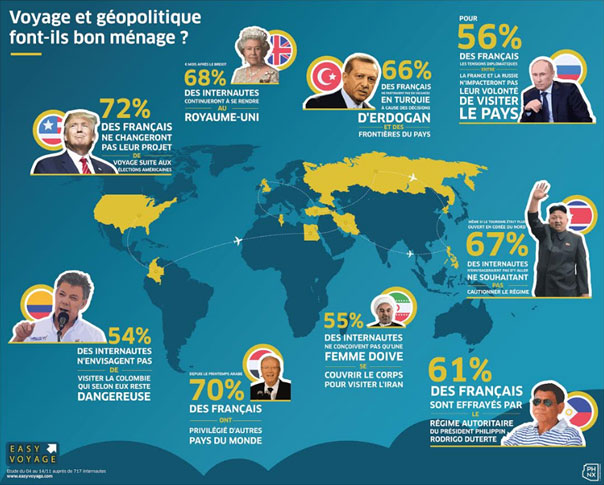 Quelques semaines se sont écoulées depuis l’élection de Donald Trump ou encore le Brexit. Mais quel est l’impact des régimes politiques sur le tourisme, et plus particulièrement les intentions de départs des Français. C’est la question que s’est posé EasyVoyage, le portail éditorial consacré au voyage le plus complet du marché. Bouleversements multiples et instabilités croissantes définissent le monde d’aujourd’hui. Alors quels sont les pays qui parviennent à tirer leur épingle de ce grand jeu géopolitique mondial ? Quelles sont les destinations « boudées» par les voyageurs ou au contraire celles qui font rêver ? Easyvoyage a mené l’enquête, résultats en image.