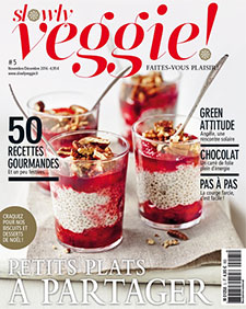 Parce qu’après les fêtes on a tous envie de manger sain, Slowly veggie propose de la cuisine végétarienne, vegan et joyeuse. Il n’est pas question de s’ennuyer devant une assiette de haricots verts vapeur. Ce sont des recettes pleines de santé et des sujets bien traités mais non militants que l’on retrouve dans ce magazine original, moderne, joyeux et 100 % végé ! Tous les deux mois en kiosque. Magazine Slowly Veggie