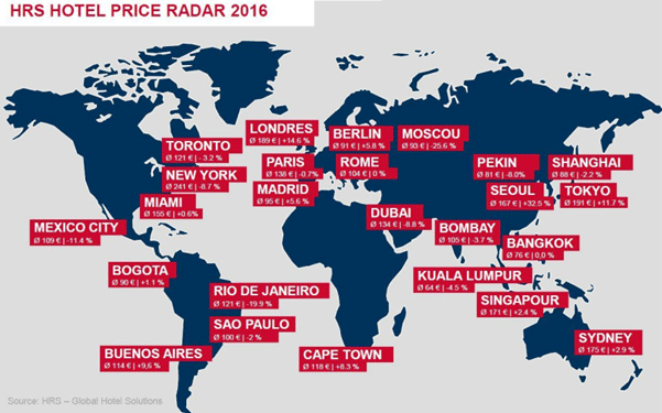 En revanche, l’hôtellerie de province reprend des couleurs. Lille (+7,2%), Marseille (+4.5%), Nantes (+4.4%) et Lyon (+2.8%) font remonter la moyenne. Des tendances qui confirment la prévision de hausse des prix de l’hôtellerie française pour 2017 annoncée au HRS Corporate Travel Forum en octobre dernier (+2.6% –source HRS Outlook)