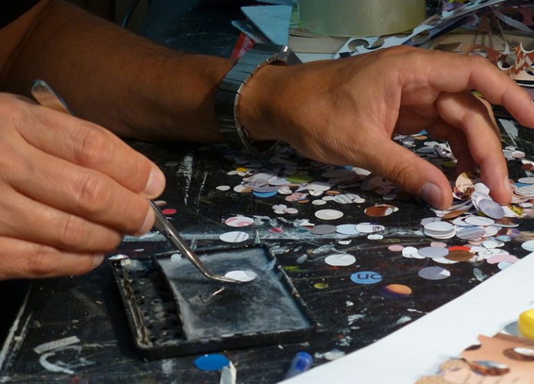 En dehors des confettis, je réalise aussi des sculptures, des grandes peintures à l’huile à plusieurs entrées de lecture, des œuvres magnétiques où chaque pixel est un aimant et tous réunis forment un puzzle. Le public peut ensuite bouger les pièces pour créer sa propre œuvre.