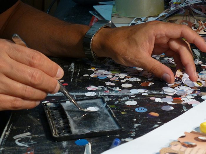 En dehors des confettis, je réalise aussi des sculptures, des grandes peintures à l’huile à plusieurs entrées de lecture, des œuvres magnétiques où chaque pixel est un aimant et tous réunis forment un puzzle. Le public peut ensuite bouger les pièces pour créer sa propre œuvre.
