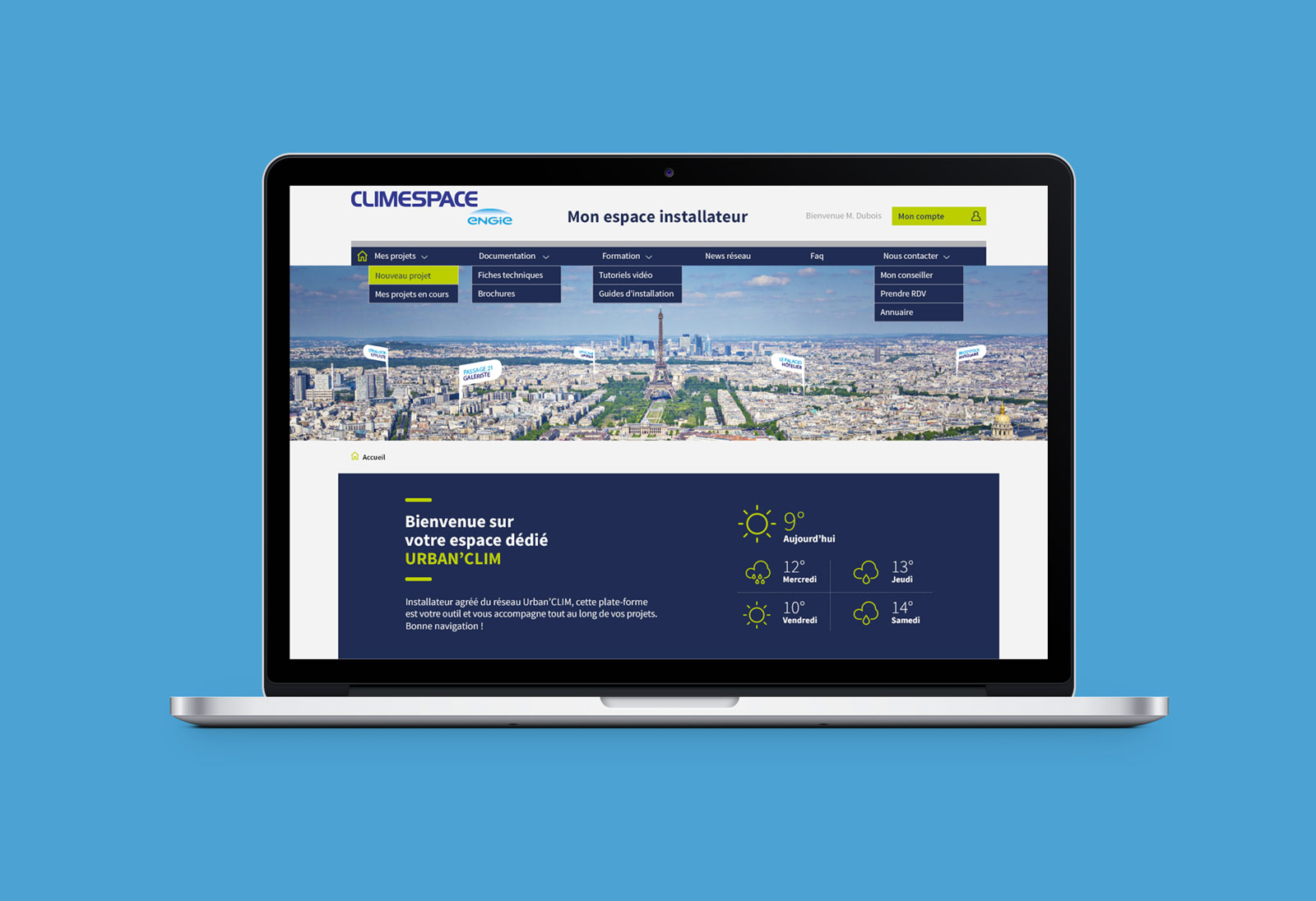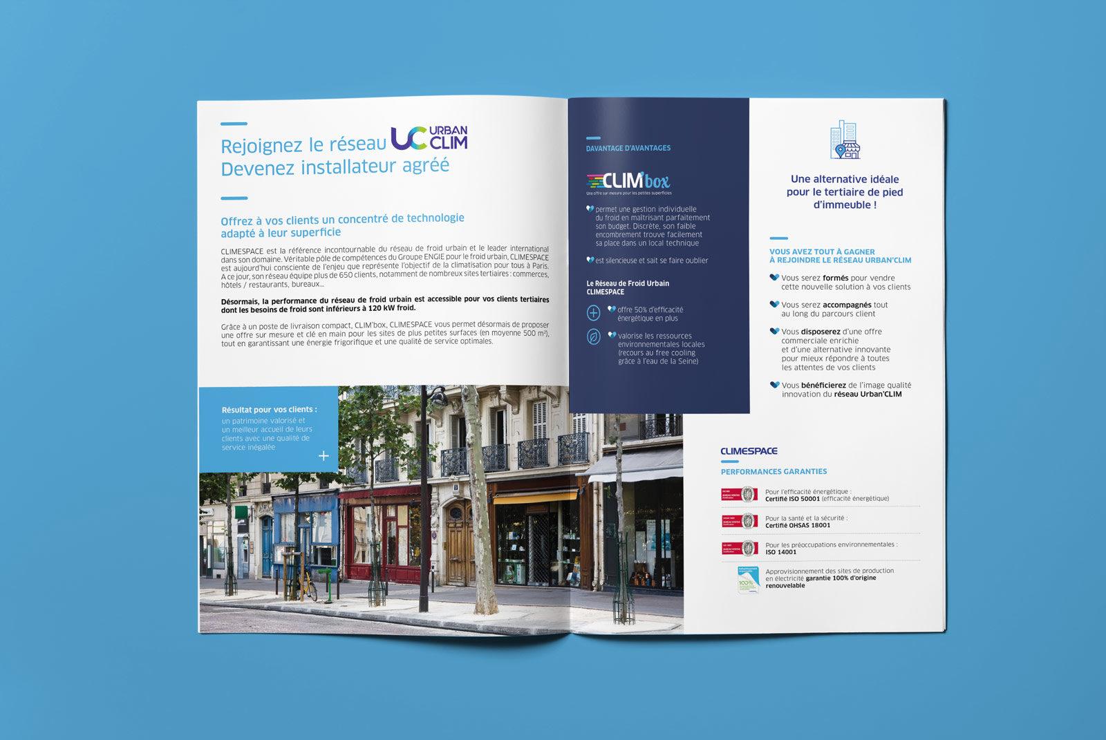 Le territoire graphique se veut à la fois urbain et haut-de-gamme, à l’image de la solution CLIM’box et est décliné sur des brochures et un Extranet dédié aux installateurs agrées.