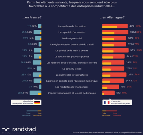 La recette du succès de l’industrie allemande ? Tout d’abord, Français et Allemands ne misent pas sur les mêmes leviers. Alors que les Français estiment que leur « capacité à investir et à innover » est l’élément qui contribue le plus (58 %) à leur compétitivité, les industriels allemands soulignent quant à eux leur « capacité à recruter de la main d’œuvre qualifiée » (53 %), suivie des « relations avec les sous-traitants » (40 %). Bref, là où les Français semblent privilégier les process, les Allemands préfèrent de leur côté investir dans les ressources.