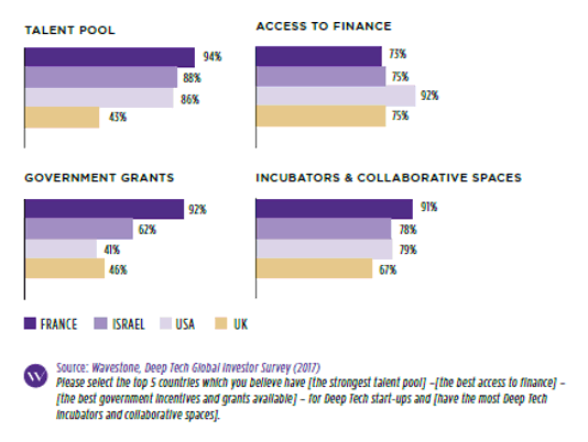 La France n’est pas en reste : 61% des investisseurs classent la France dans leur Top 5 des destinations pour investir dans la Deep Tech et pour la toute première fois, le pays a pris la tête des levées de fonds VC en 2017 (2,7 milliard d’euros levés) en Europe.