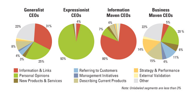 Parce qu’un internaute va suivre un CEO en fonction de son entreprise, des valeurs et donc de son opinion, mais qu’il va aussi être attentif à son comportement. Les CEO’s ont donc des « profils » bien distincts sur Twitter. Une typologie a d’ailleurs été développée par Claudia Kubowicz Malhotra et Arvind Malhotra dans le MIT Sloan Management Review.