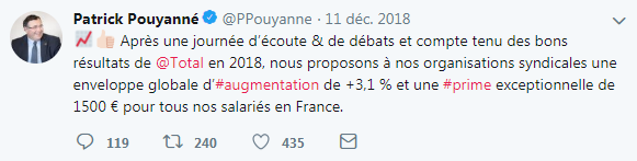 Pas étonnant que Patrick Pouyanné, PDG de Total, ait annoncé le 11 décembre dernier le versement d’une prime exceptionnelle à ses salariés en exclusivité sur Twitter. L’effet d’annonce a pris une toute autre ampleur, dans la presse et a fortiori sur le grand public. Et c’est ce que désire ce dernier, puisque 70 % des internautes estiment qu’un dirigeant doit avoir un compte Twitter !