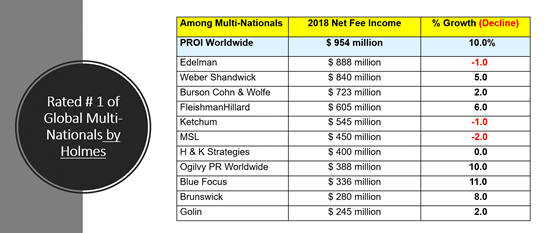 Avec une augmentation de 10% de son chiffre d’affaires en 2018 pour atteindre presque 1 milliard de dollars (US), PROI Worldwide est désormais le premier acteur mondial en communication et le cinquième réseau d’agences au monde, d’après le rapport dévoilé par The Holmes Report (leader de référence mondial en notation des organisations de relations publics). Sa progression se compare à une hausse globale du secteur des relations publics de 5% atteignant les 15,5 milliards de dollars (US).
