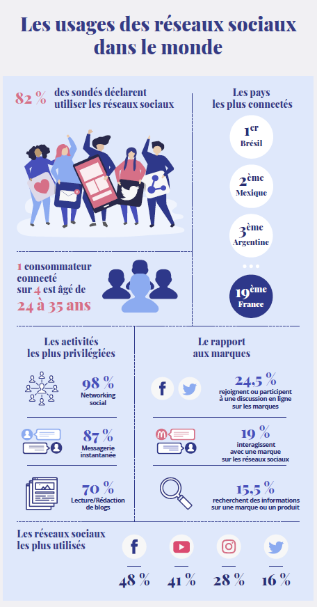 Comme l’évoquait déjà le quotidien Le Monde en 2011, les réseaux sociaux connaissent en Amérique latine un succès inégalable : les trois pays avec le taux de pénétration le plus élevé sont le Brésil, le Mexique et l’Argentine. La raison principale ? Des SMS payants qui ont rapidement poussé les populations vers les réseaux sociaux (et notamment WhatsApp) gratuits. Autre raison : ces plateformes jouent un rôle prépondérant lors de mobilisations citoyennes, comme au Brésil en 2013. La France n’arrive qu’en 19ème position.